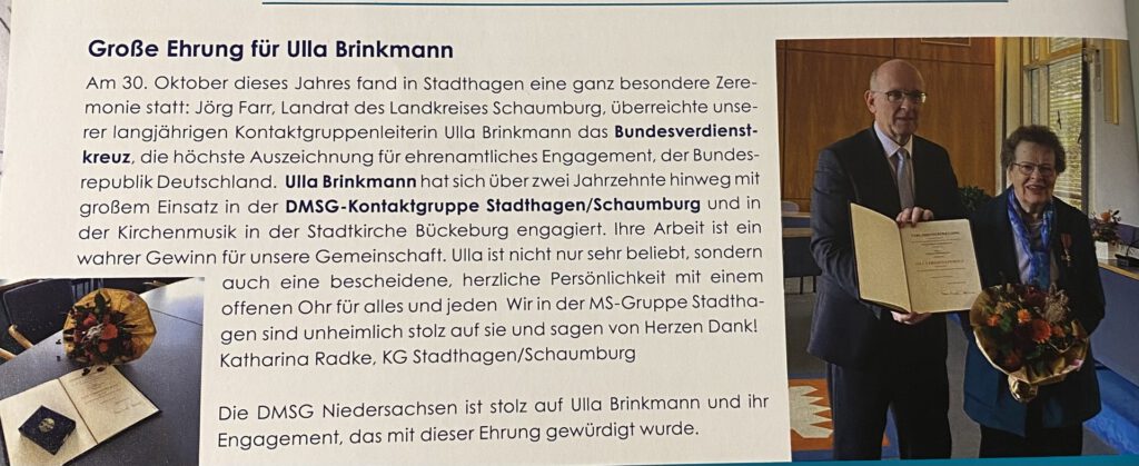 Bilder DMSG Zeitschrift, Dezember 2025 30.Oktober 2025, StadthagenBundesverdienstkreuzverleihung an Ulla Brinkmann -Kontaktgruppenleiterin Januar 2025, Rinteln Wiedensahl, Museum Wilhelm Busch September 2025, Wiedensahl, Ausflug